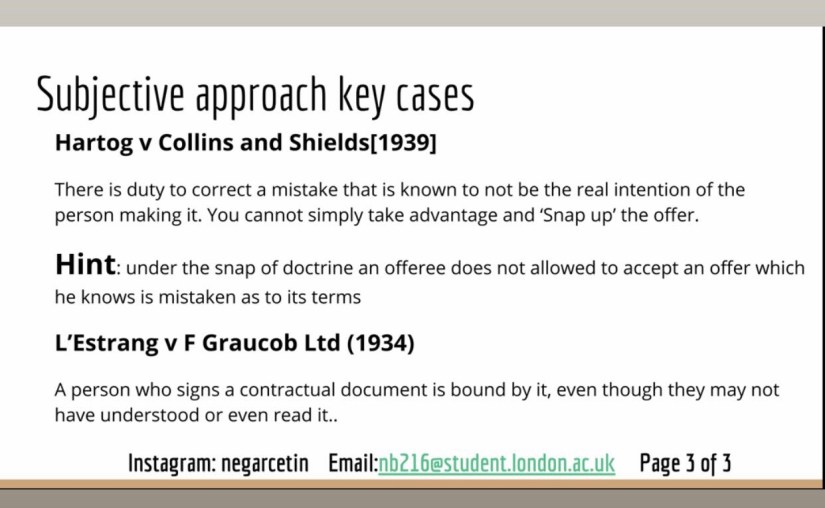 The court normally uses an objective test to assess if an agreement between two parties exist Smith V Hughes (1871). However, the court may adopt subjective approach under the ‘Snapping up’ theory.